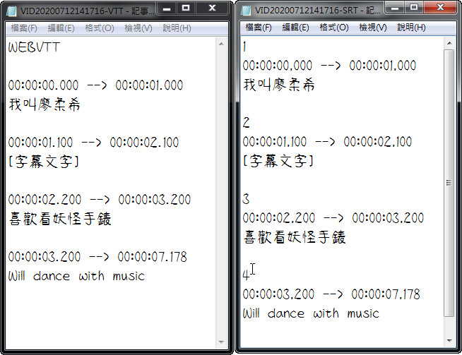下圖左側是 vtt格式的字幕,右側是 srt格式的字幕,看出來了嗎。