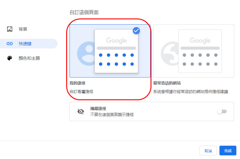 在『快速鍵』這裡,勾選『我的捷徑』之後,再按下完成。