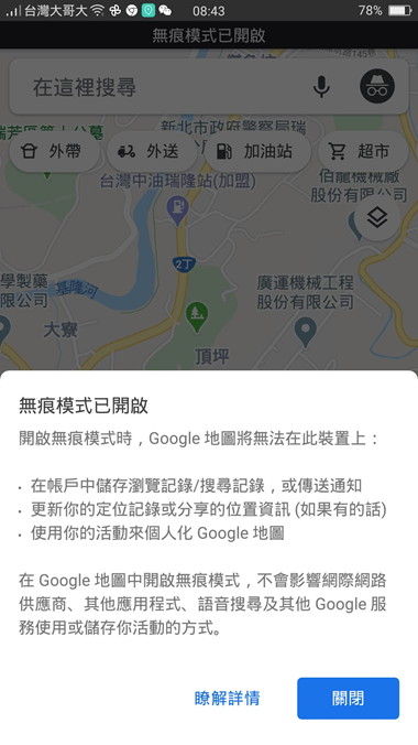 『開啟無痕模式』按下去之後,google地圖會重新啟動一次,然後我們就可以看到『無痕模式已開啟』的說明。