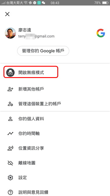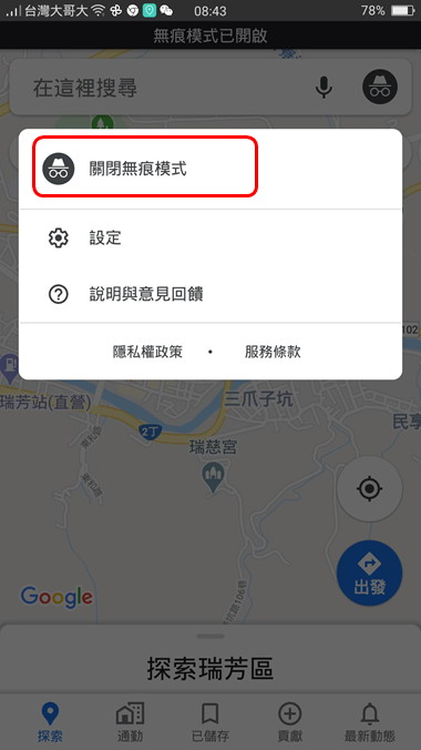除了這兩個方法之外,我們也可以在手機上,打開 google地圖的無痕模式,讓 google地圖不要記錄我們去過那些地方。