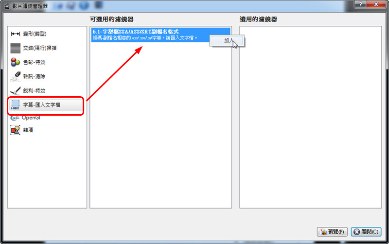 點一下左側的『字幕-匯入文字檔』,接著在『可選用的濾鏡器』這一欄中就可以看到『6.1-字型檔 SSA/ASS/SRT副檔名格式』。我們在上面按滑鼠右鍵後,點擊『加入』。