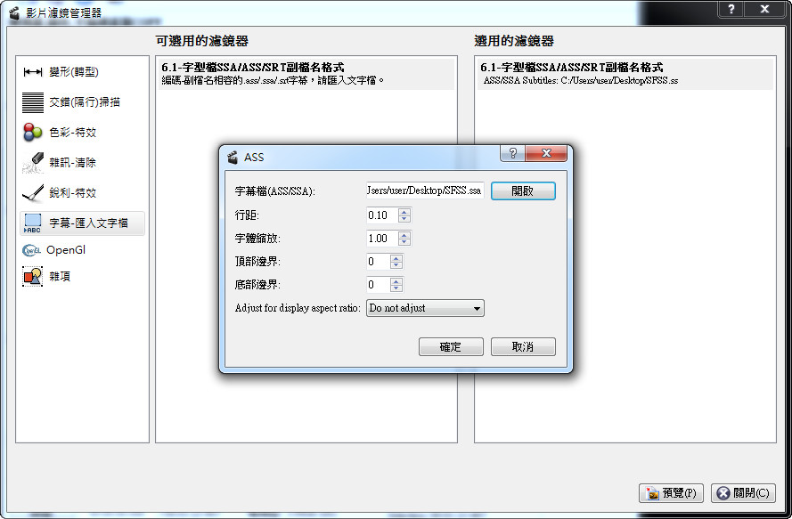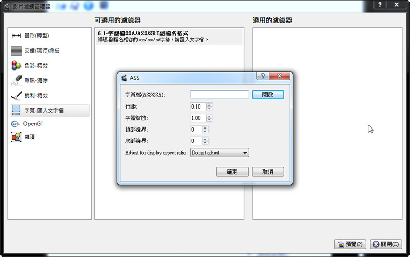 我載入的是一個 SRT檔,Avidemux會自動的幫我們轉成 SSA檔。
