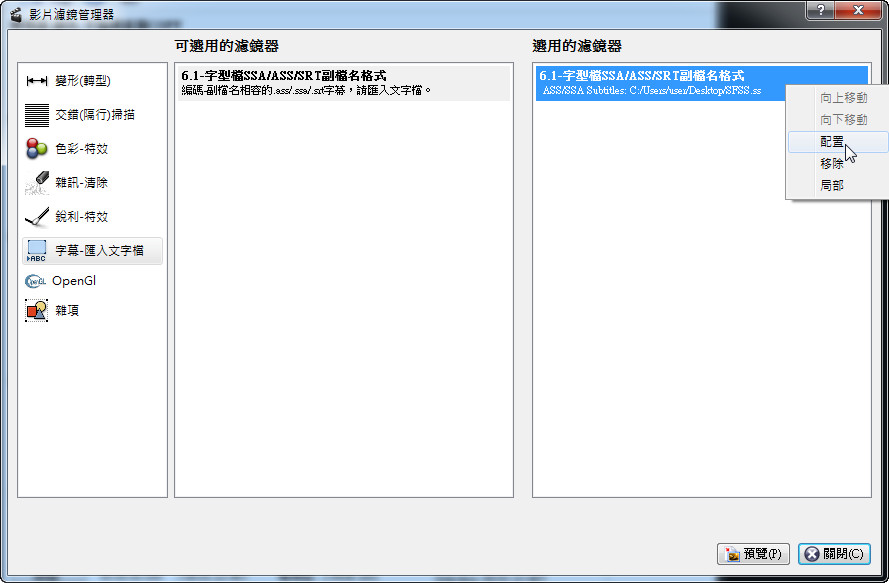 字幕加入之後,我們可以在『選用的濾鏡器』這一欄下面,在『6.1-字型檔 SSA/ASS/SRT副檔名格式』上按滑鼠右鍵,點擊『配置』,來調整字幕大小以及出現的位置。