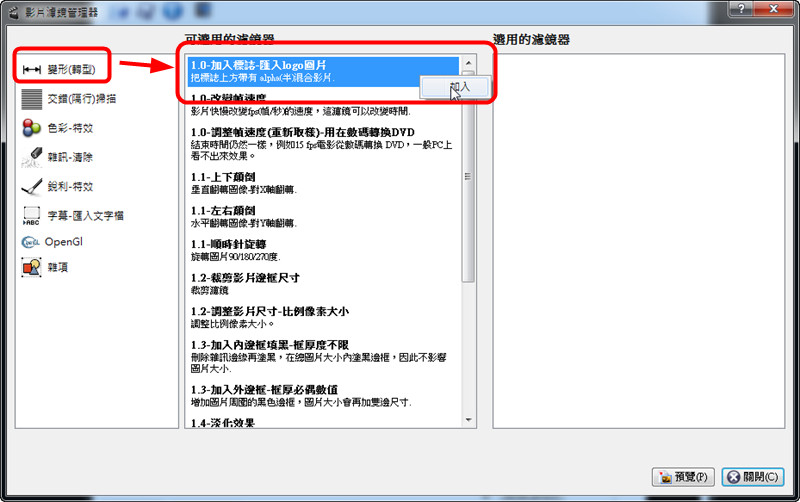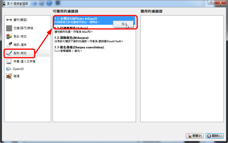 蓋住浮水印的濾鏡在『銳利-特效』下的『5.1去標誌2』,同樣在上頭按滑鼠右鍵後,點『加入』。