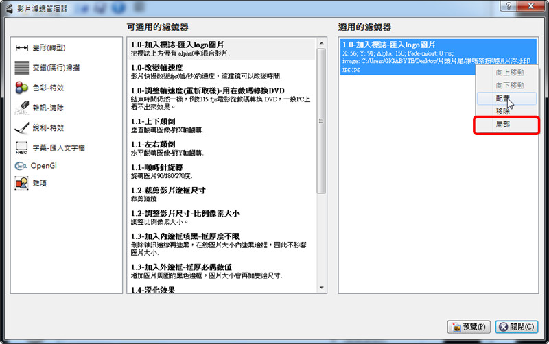 跟加入浮水印一樣,要蓋住浮水印的濾鏡,同樣有『局部』的功能在。