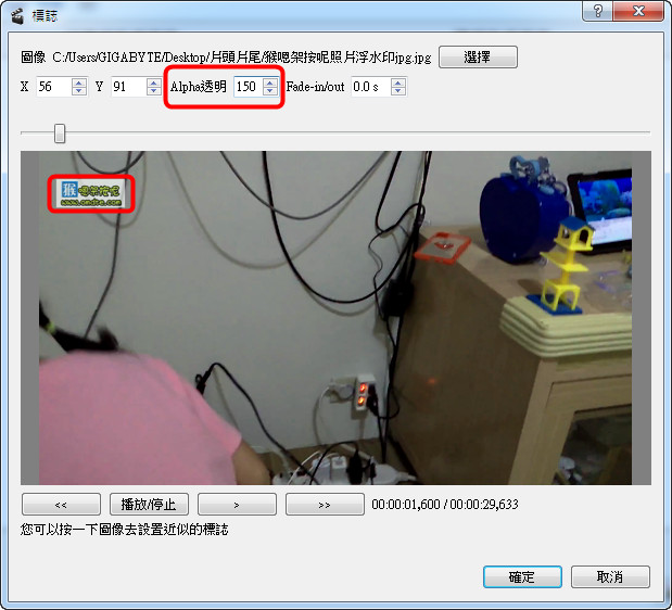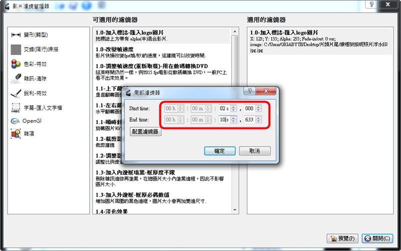 Avidemux在加入浮水印的時候,可以控制浮水印出現的時間點。