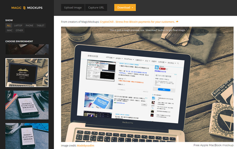 這裡就不止可以把圖片套用手機框、筆電框、電腦框,也有很多其它的東西可以套用,海報、車子、馬克杯、T裇等等的,而且下載的時候還有高清的圖片可以選擇,非常的好用。