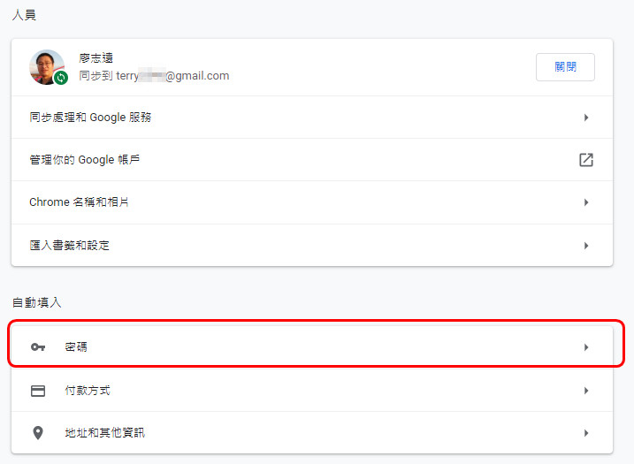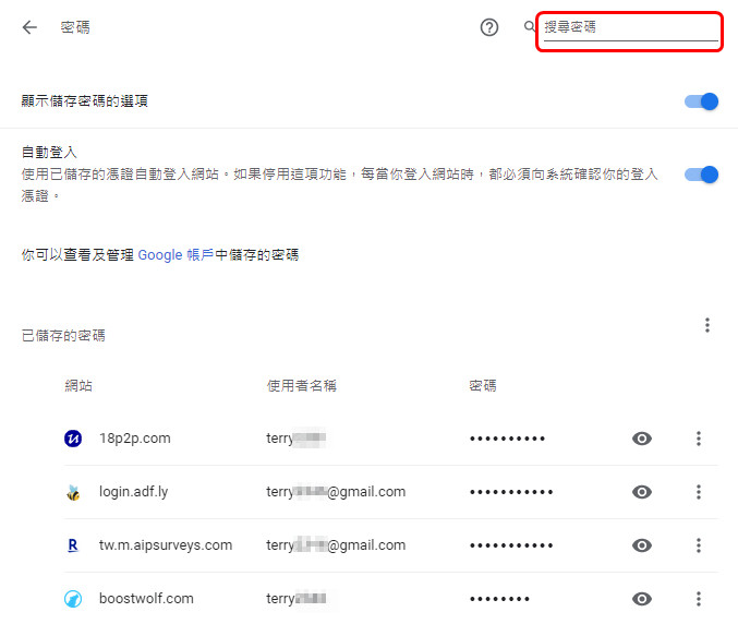 這裡就會列出所有 chrome幫我們記錄過密碼的網站,我們可以從右上角「搜尋密碼」的搜尋框中,輸入網站的名稱來做搜尋。