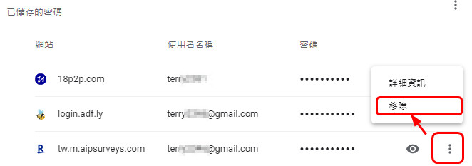 找到之後,就可以點最右方「更多動作」的按鈕,來將記錄過的密碼移除。