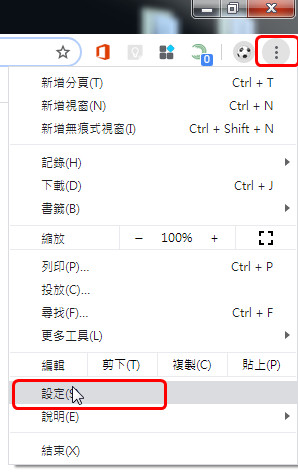 我們在 chrome的工具列上,點擊最右方的「自訂及管理 chrome按鈕」,點擊「設定」。
