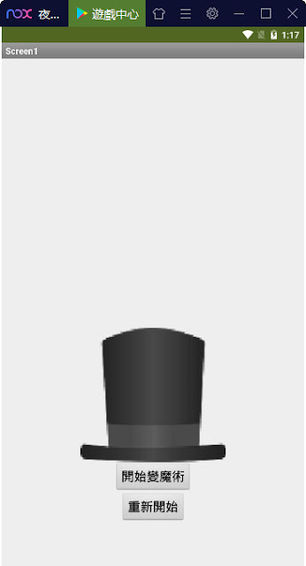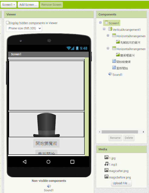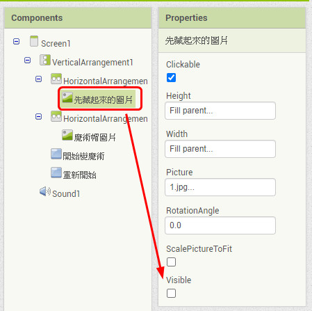 設定了兩個『HorizontalArrangement』水平區塊。一個放先藏起的圖片,一個放按鈕和魔術帽的圖片。