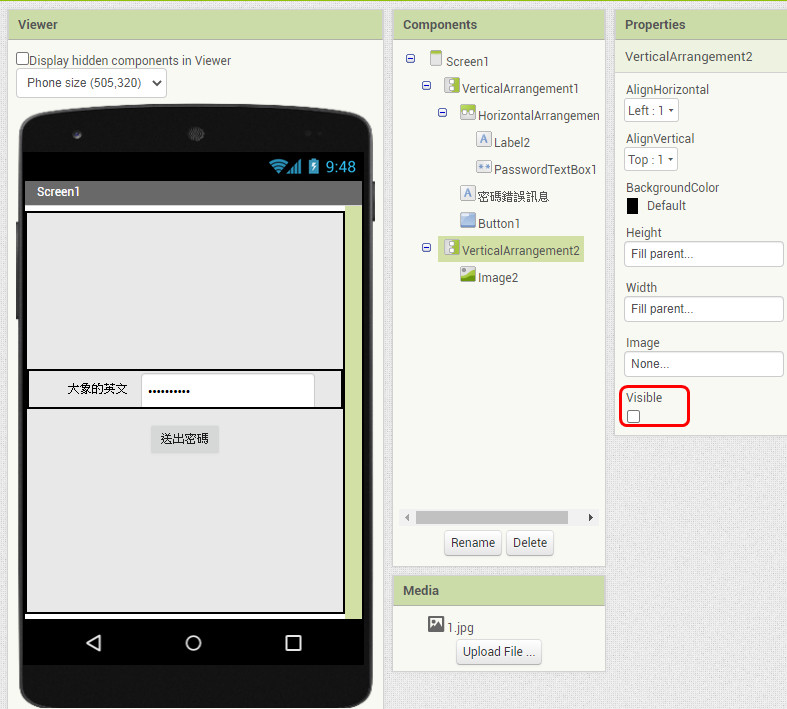 就把『VerticalArrangement1.Visible』的可見性,設定成『false』,讓它不被看見。