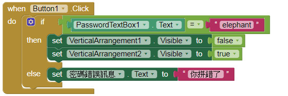 如果『PasswordTextBox1』輸入的內容,等於 “elephant”這件事沒有發生的話。