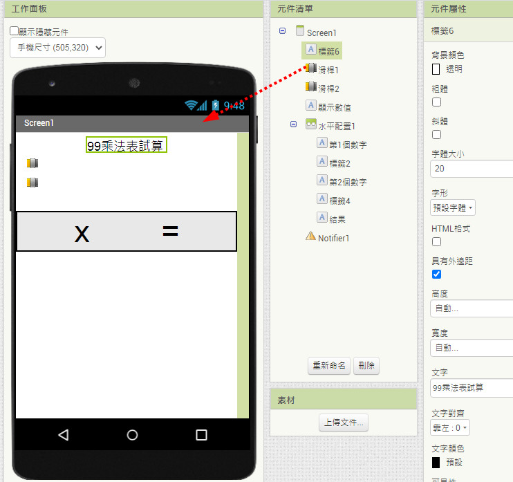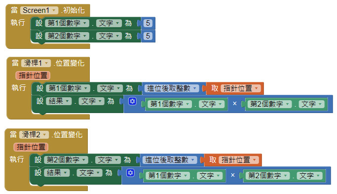 至於為什麼要先設定這兩個數字,因為滑桿元件在初始化的時候,是沒有數值的,一直要到滑動滑桿才會有值產生。這樣就會造成九九乘法表沒有數字相乘的錯誤。我又找不到設定它預設值的方法,乾脆就先把這兩個標籤的數字給訂下來。