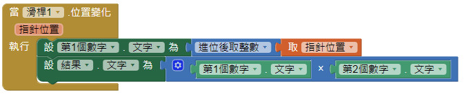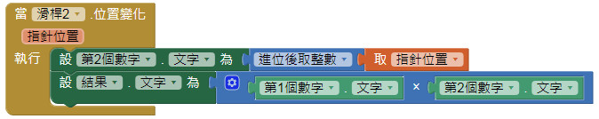 這裡要注意的是滑桿指針位置取值的時候,取的不是整數,所以這裡用數學方塊的進位後取整數,把指針位置的值給調整成整數。取整數的方法在 app inventor中,有四捨五入、進位後取整數以及捨去後取整數,這個部份就看大家喜歡用那一種。