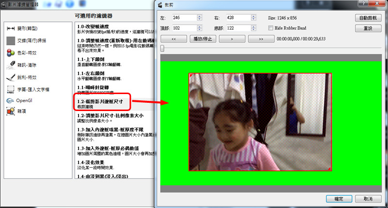 如果影片的畫面太大太寬,我們就用這個功能,用紅框把要保留的地方框起來,輸出檔案的時候,就會把綠色的部份給裁掉,只保留我們想要的區域。