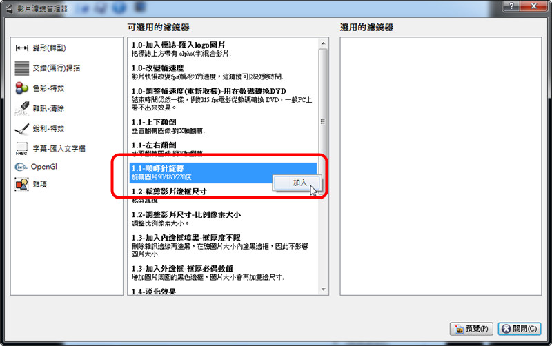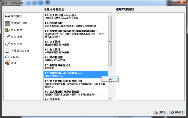 這次要套用的濾鏡,同樣是在『變形』的『1.2調整影片尺寸比例像素大小』。