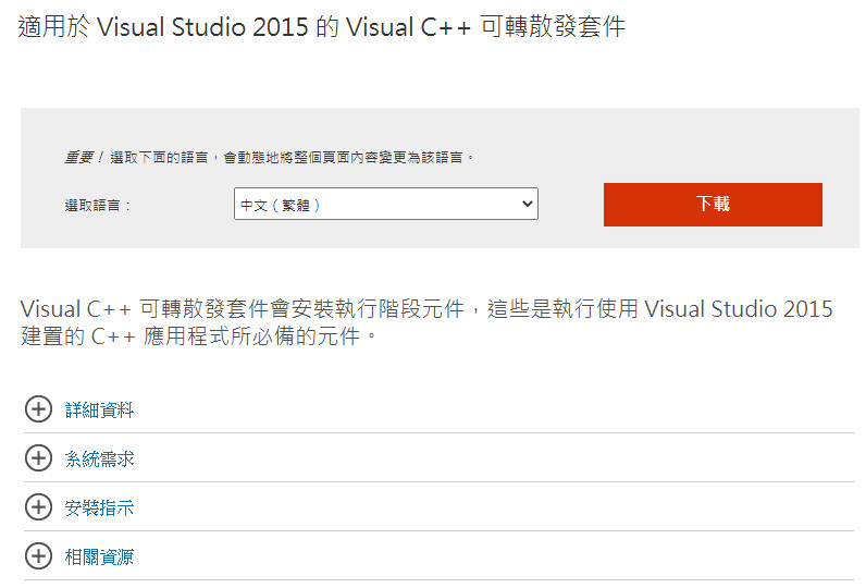我們到 windows的官網,點擊下載。下載 Visual Studio 2015 的 Visual C++ 可轉散發套件。