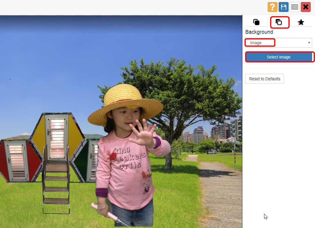 PhotoScissors還有提供套用背景的服務。我們可以在Background的下拉選單中,選擇[Image],從[Select Image]的按鈕來上傳我們要套用的背景。這裡我用的就是紅綠燈顏色的小屋。
