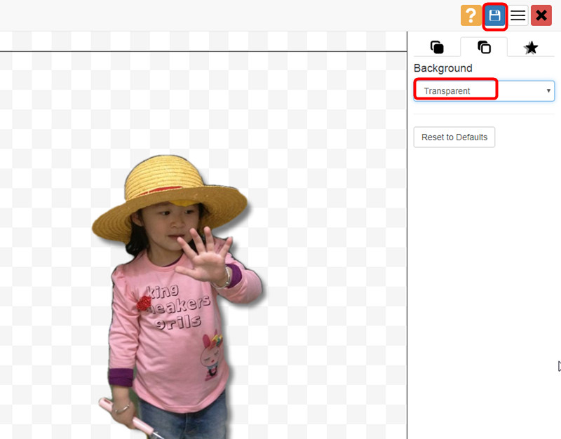 最後,我們要下載的時候,記得要回到Backgroun這裡,選擇Transparent,再點上方的儲存圖示按鈕,這樣下載圖片的照片才會是背景透明的png檔。