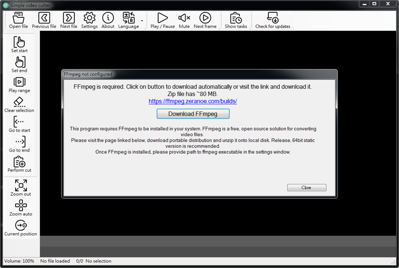 打開軟體之後,會需要在下載 FFmepg。這個是必需的,所以我們就下載吧。