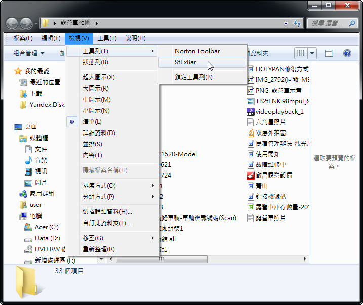 接著,我們就會看到檔案夾的工具列上,多了『StExBar』的工具列。它的功能有好幾個,有點亂。