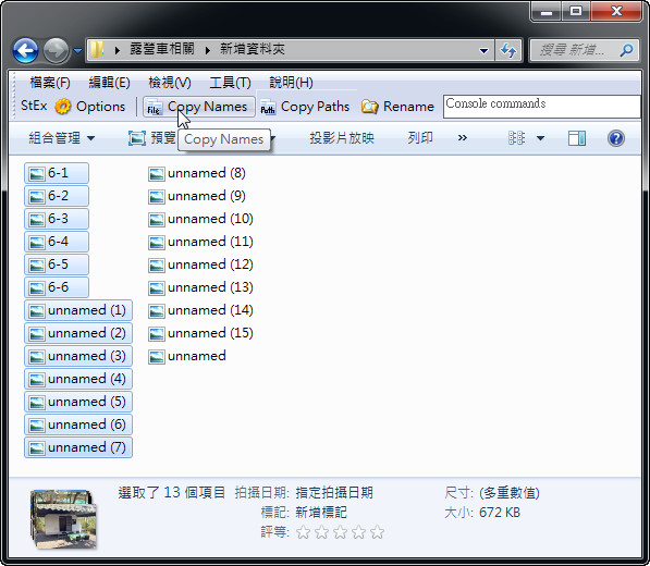 批次複製檔案名稱時,我們就先多選檔案或是資料夾,然後按下『Copy Names』按鈕。
