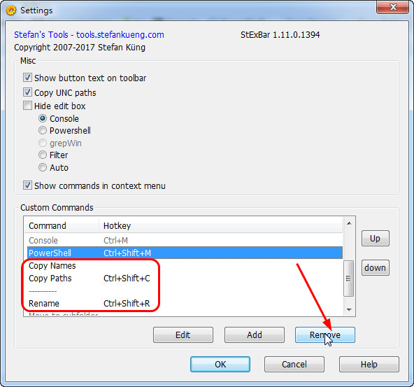 我們看到『Custom Commands』框中,點擊我們不想讓它出現的功能之後,按下『Remove』按鈕,然後這個功能會變灰色,就不會出現在工具列上