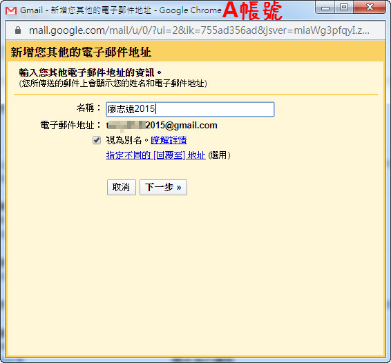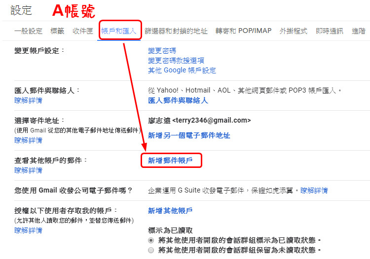 我們從 A帳號的 gmail信箱中,點齒輪,然後點帳戶和匯入,點新增郵件帳戶。