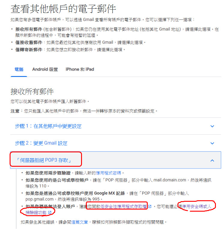 接下來的幾個步驟,看起來好像會有一點不安全。關於這點,大家可能參考一下 GOOGLE說明頁面的查看其它帳戶的電子郵件的說明。照著做就沒錯了。