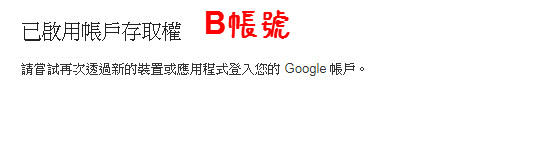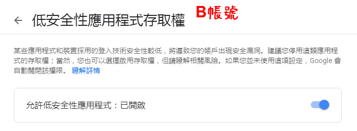 從 B帳號點擊步驟 7查看其它帳戶的電子郵件中的開啟低安全性應用程式存取權。