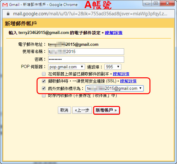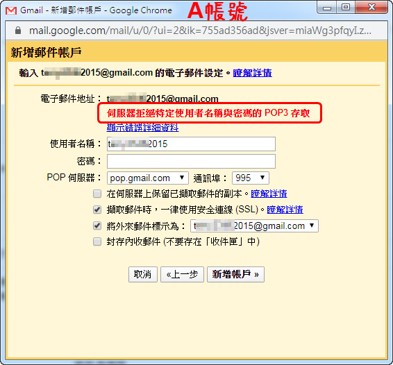 重新把 B帳號的使用者名稱和密碼再輸入一次後,按下新增帳戶。