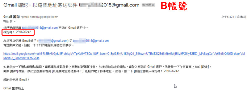 從 B帳號點擊步驟 7查看其它帳戶的電子郵件中的停用安全碼或人機驗證功能。