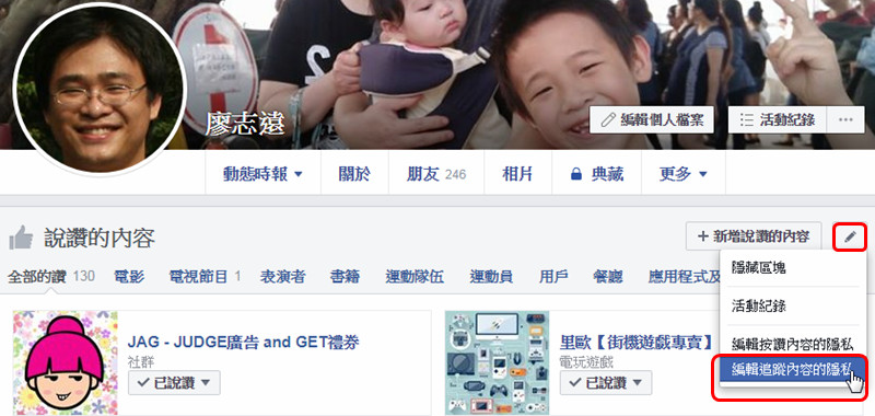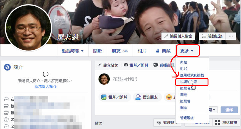 我們進到FACEBOOK之後,點自己的帳號,在”更多“這裡,找到”說讚的內容”