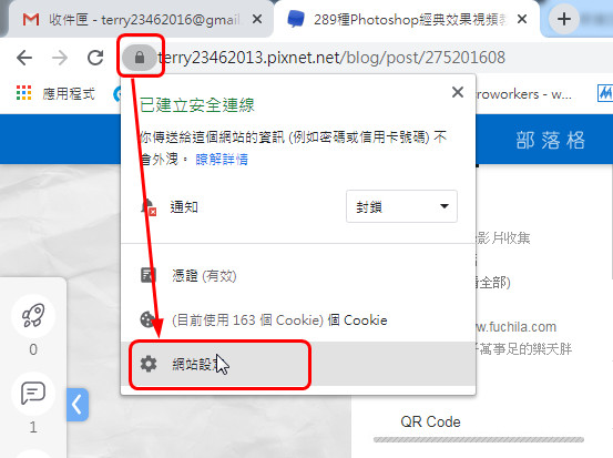 我們把滑鼠移到網址列上的灰色的鎖頭點一下,點擊網站設定。