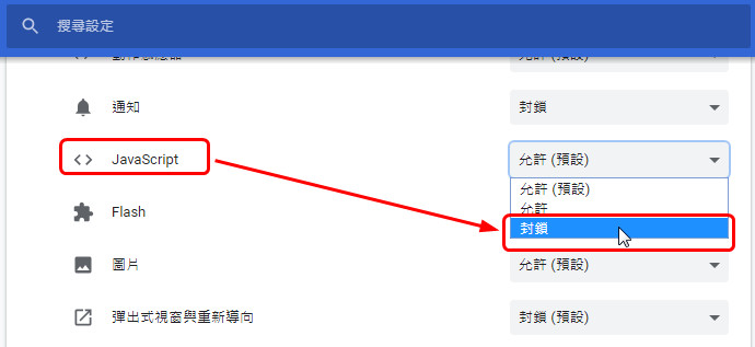 然後找到 JavaScript這一項,把允許的預設值更改成封鎖。
