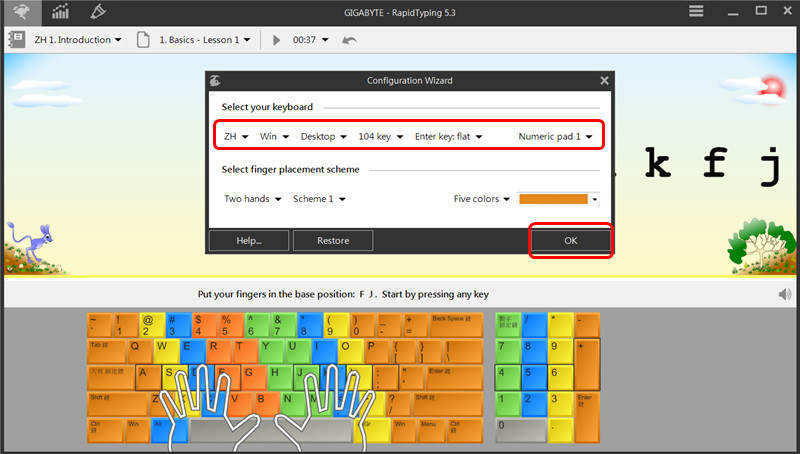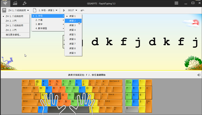 進入主畫面之後,可以從上方幾個內建好的課程來,來練習英文打字。它畫面切成上下兩塊,上面的地方是要打字的內容,下方有彩色鍵盤和手指的地方,會即時的顯示,這個英文字要怎麼打。非常的方便。