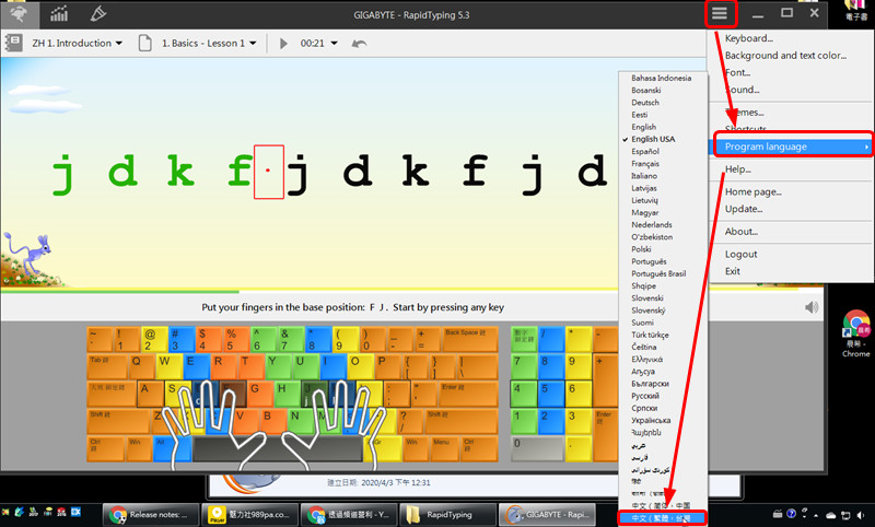 接著,我們來把 RapidTyping的操作介面改新成中文。RapidTyping本身就有多語系的支援,大家從下圖的紅框和箭頭,就可以找到調整成中文介面的選項。
