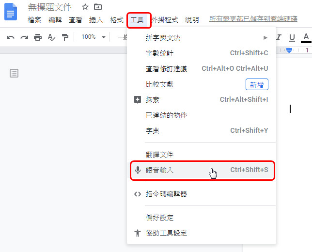 好的,我們打開一份空白的 google文件,我們點一下工具,就可以找到語音輸入的部份。