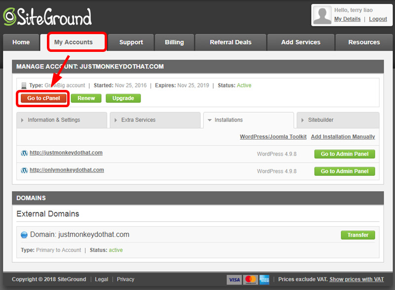 首先我們登入siteground之後,點My Accounts,再點Go to cPanel進入到管理的介面。