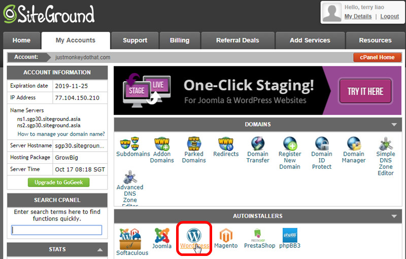首先我們登入siteground之後,點My Accounts,再點Go to cPanel進入到管理的介面。