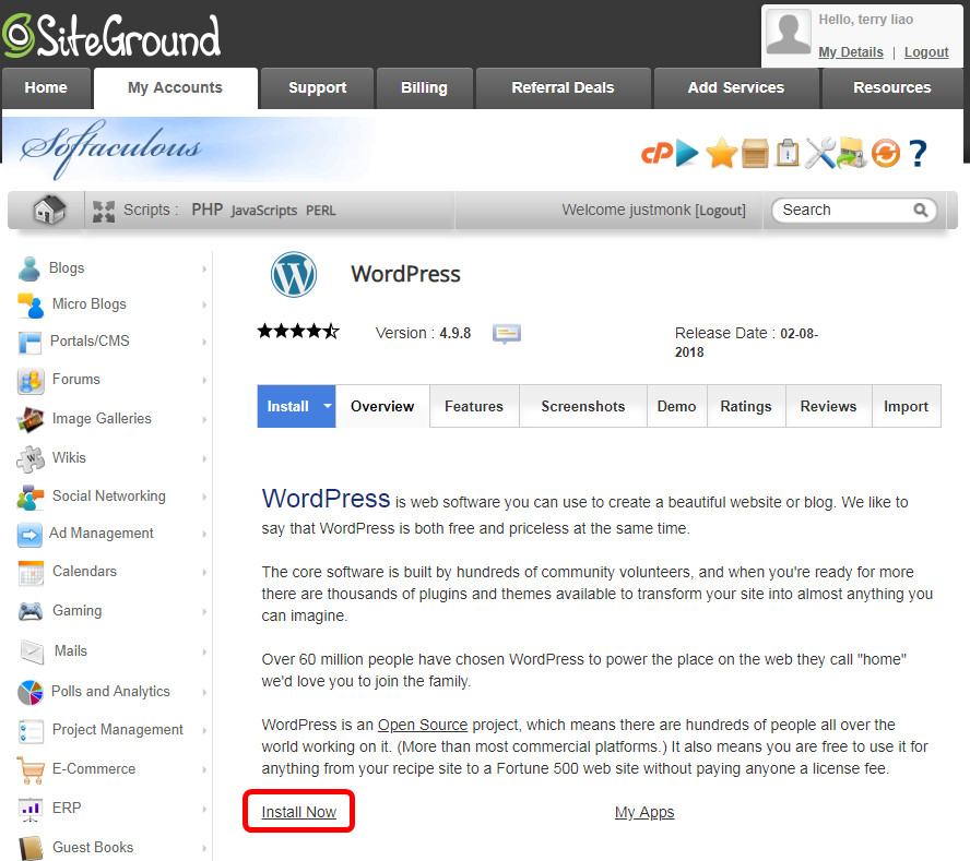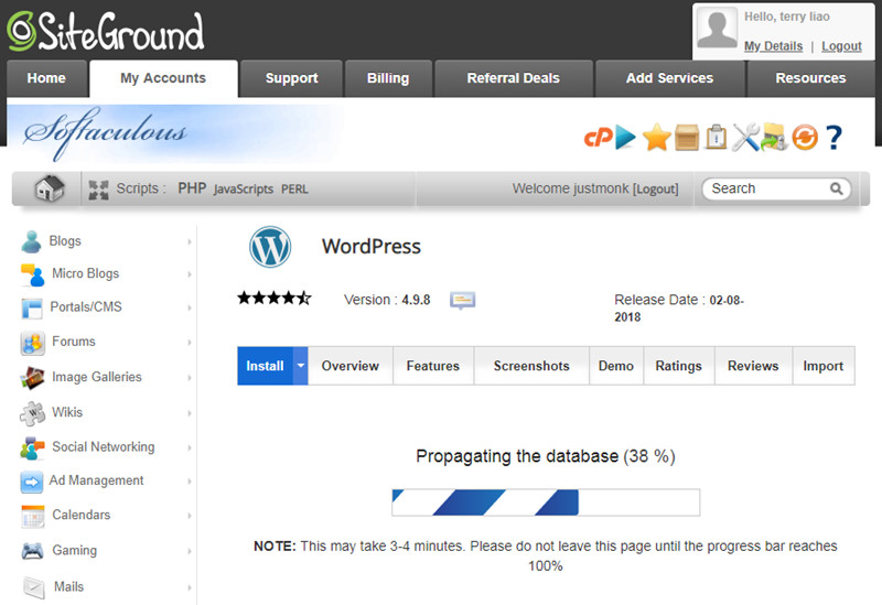 也不止siteground的cPanel裡頭有快速安裝wordpress的選項,其它像bluehoste或是hostgator主機提供的cPanel裡頭也有安裝wordpress的選項,因為我現在的主機用的是siteground所以直接來介紹,只要5分鐘,就能在Siteground快速安裝一個Wordpress網站。