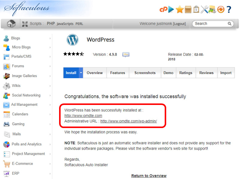 安裝完成後,就會看到已經安裝完成的網址和登入後台的連結。
