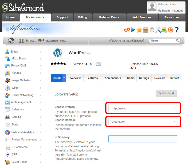 Choose Doman的地方,自然就是選擇我們要安裝的域名。這裡要先把第二個域名加到siteground的話,這裡才會出現新域名的選項。