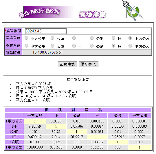 接著我用台北市政夜地政局的面積換算工具,來看一下這個面積是幾坪。