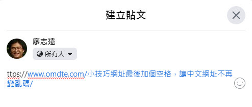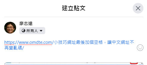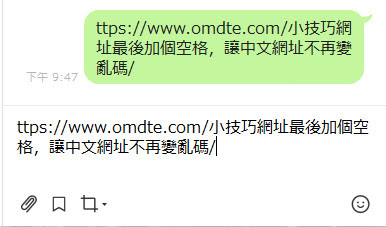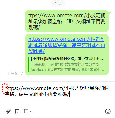 還好,還有一個稍微麻煩點的方法可以用,就是我們複製網址的時候,不要複製到網址 http最前面的那個 h,把這一串貼到 facebook或是line上之後,我們再自己補上 h,這樣就會正確的顯示中文的網址。