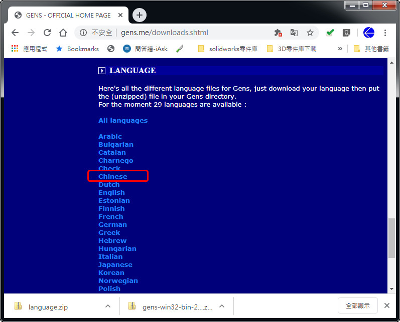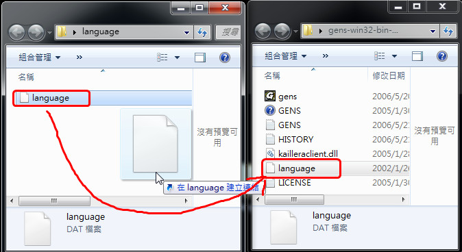 這兩個下載回來的檔案,我們都把它解壓縮。然後,把語系檔中的 language這個檔案,複製到 gens的主資料夾內。但這樣還沒完成繁體語系的更改了。
