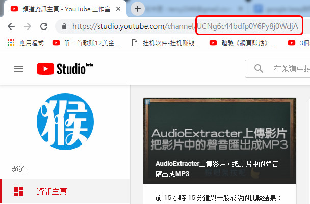 然後我們可以看到我們頻道的網址是https://studio.youtube.com/channel/xxxxxxxxxxxxxx,https://studio.youtube.com/channel/後面的xxxxxxxxxxxxxx就是我們的頻道ID。我們先把這個xxxxxxxxxxxxxx給複製下來。