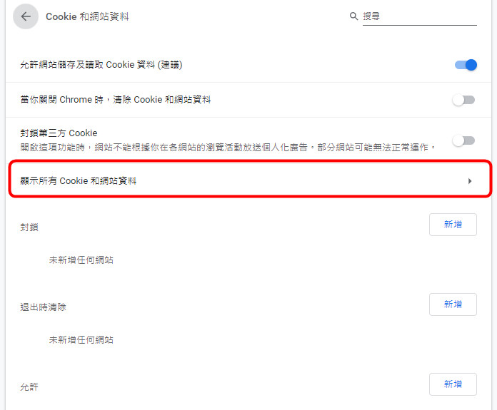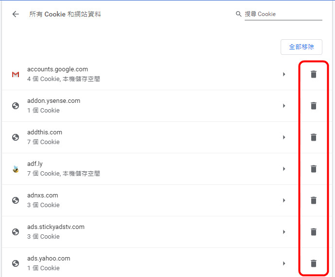 這裡就會列出所有的 cookie,我們可以用搜尋的方式找到我們的網站後,再點一下右側的垃圾桶圖示之後,就可以把特定網站的 cookie給刪除了。