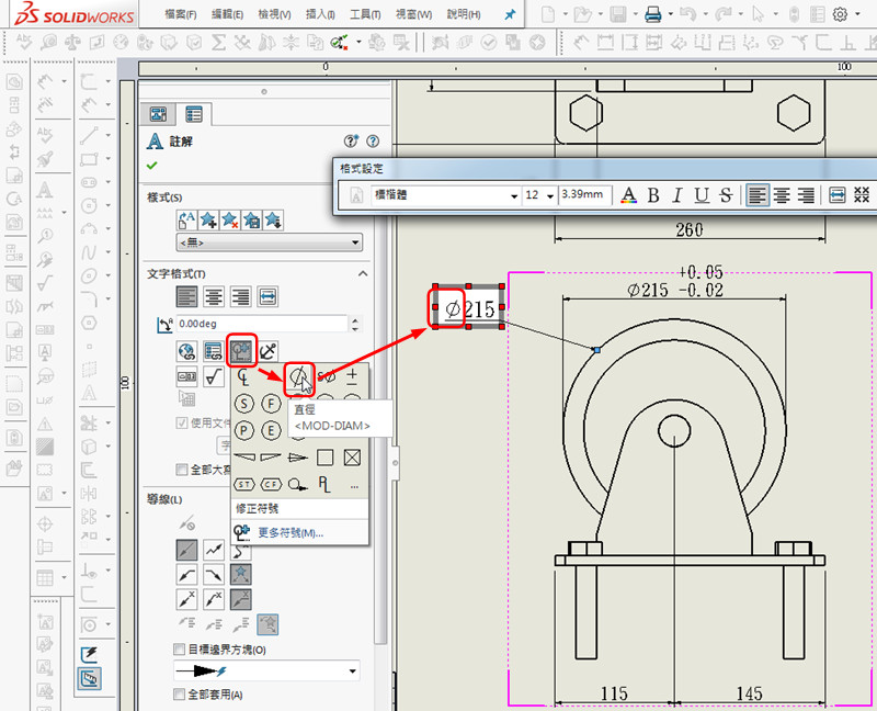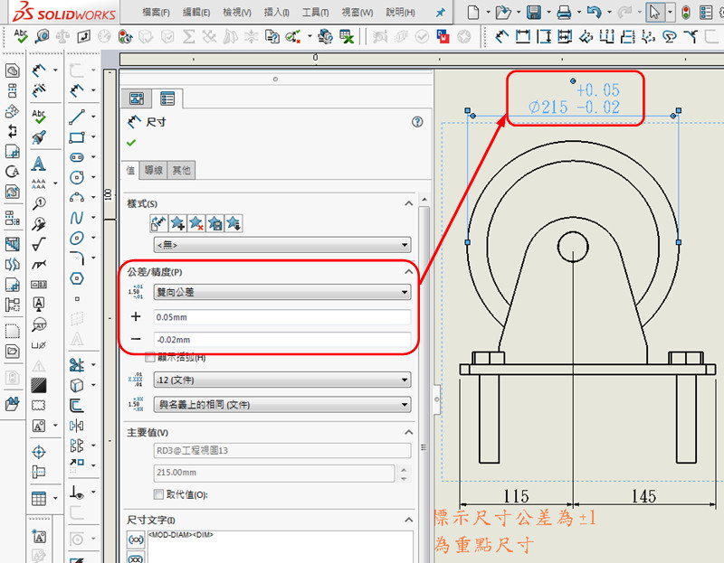 怎麼在Solidworks工程圖中,用注解來標示尺寸的公差